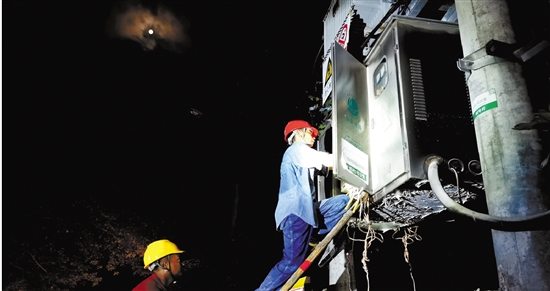 国网开化县供电公司抢修队在临海市上郭村进行台区检修复电工作