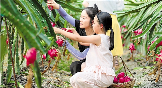 8月20日,德清县下渚湖街道和睦村的水果基地里,游客正在采摘火龙果。近年来,该县依托生态优势,大力发展现代休闲旅游采摘产业,助推乡村振兴。 本报记者 冯贺 拍友 王正 倪忆雪 摄