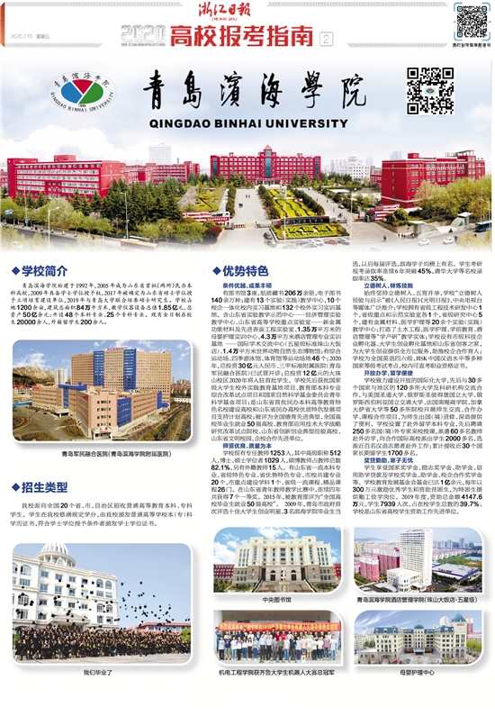 青岛滨海学院始建于1992年,2005年成为山东省首批(两所)民办本科高校,2009年具备学士学位授予权,2017年被确定为山东省硕士学位授予立项培育建设单位,2019年与青岛大学联合培养硕士研究生。学校占地1200余亩,建筑总面积84万平方米,教学仪器设备总值1.85亿元,总资产50亿余元;开设48个本科专业、25个专科专业。现有全日制在校生20000余人,外籍留学生200余人。