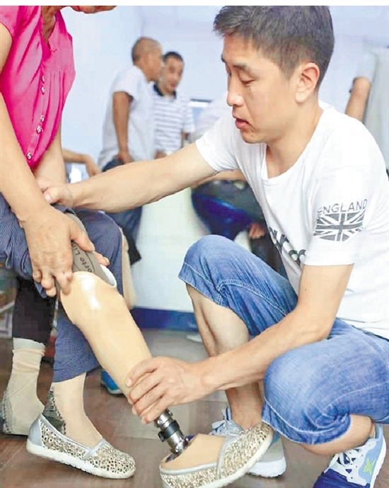 平湖市残联工作人员给残疾人安装适配假肢