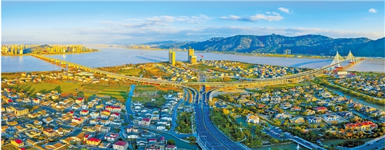 从高空俯瞰七都岛,气势恢宏的七都大桥像一对扇动的翅膀。