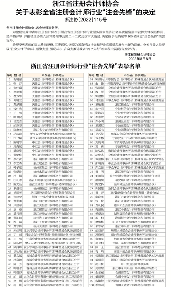 为激励优秀中青年注册会计师在引领我省注册会计师行业服务国家经济社会高质量发展中发挥先锋模范作用,经严格评审,并报省注协第六届常务理事会第二十二次会议审议通过,决定授予毛晓东等100名同志“注会先锋”荣誉称号。