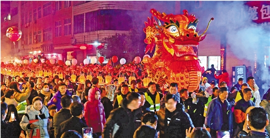 2月3日晚,永康市龙山镇四路口上村“板凳龙”表演引来数万群众观赏。一条由400多条板凳首尾相连组成的“板凳龙”,在400多名村民共同舞动下,走街串巷送祝福,欢庆元宵佳节。 本报记者 潘秋亚 拍友 时补法 摄 |
