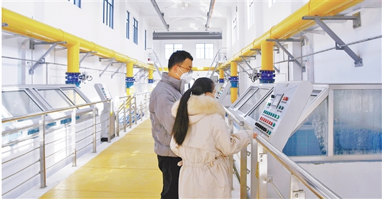 工行台州玉环支行客户经理(左)调研玉环南部湾饮水工程设备运行情况