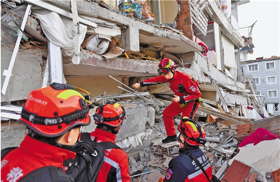 2月8日,中国救援队队员在土耳其哈塔伊的一处地震废墟搜救。 新华社发