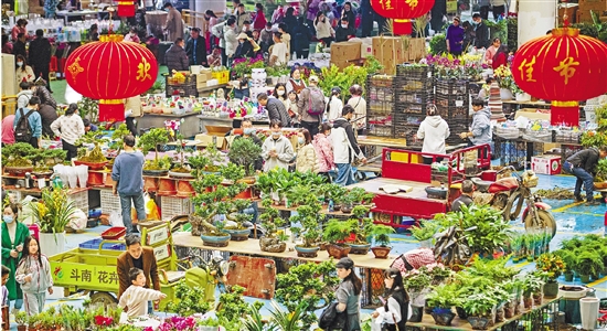 春节期间,昆明斗南花卉市场鲜切花交易量约7756万枝,交易额超过1亿元,市场日均游客量超2万人次;昆明国际花拍中心春节期间拍卖交易总量达1160万枝。图为游客在昆明斗南花市参观游览、选购植物(1月31日摄)。 新华社记者 陈欣波 摄 |