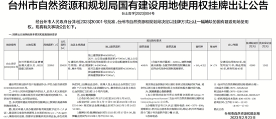 经台州市人民政府台供地[2023]30001号批准,台州市自然资源和规划局决定以挂牌方式出让一幅地块的国有建设用地使用权。现将有关事项公告如下:
