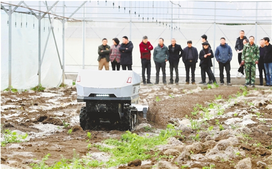 2月23日,东阳市南马镇花园村现代农业生态园大棚内,农机设备工作人员向种植大户展示新型农耕机械操作方式,为春耕备耕提供技术支持。 共享联盟·东阳 包康轩 王江红 摄