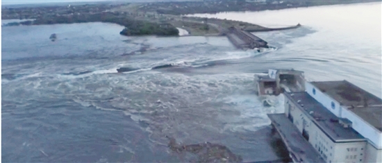 这是6月6日在赫尔松州拍摄的被炸毁的卡霍夫卡水电站大坝(视频截图)。 新华社发