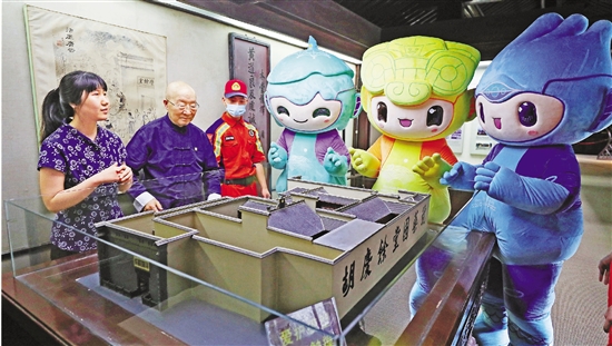 6月6日,亚运吉祥物琮琮、宸宸、莲莲走进杭州胡庆余堂,感受中国传统中医药文化的魅力。杭州亚运会多个场馆都有中医药文化展示区域,是展示亚运文化的重要组成部分。 本报记者 魏志阳 摄