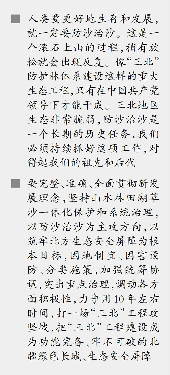 ■ 人类要更好地生存和发展,就一定要防沙治沙。这是一个滚石上山的过程,稍有放松就会出现反复。像“三北”防护林体系建设这样的重大生态工程,只有在中国共产党领导下才能干成。三北地区生态非常脆弱,防沙治沙是一个长期的历史任务,我们必须持续抓好这项工作,对得起我们的祖先和后代