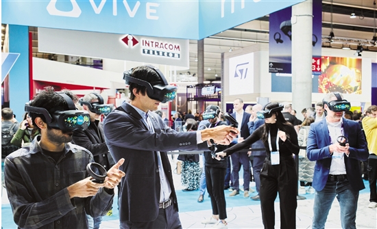 参观者在2023世界移动通信大会上体验虚拟现实技术。 新华社发