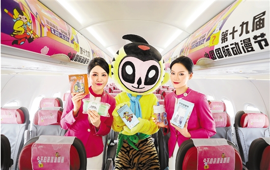 6月8日,杭州萧山国际机场联合长龙航空举行动漫节主题航班发布活动,为即将到来的第十九届中国国际动漫节预热。航班内部以动漫节为主题进行布置,头巾、行李架、小桌板等都装点了动漫元素,还配备了动漫节吉祥物“乐乐”与长龙航空吉祥物“龙宝”联合发布的系列衍生产品等。 本报记者 魏志阳 摄 |