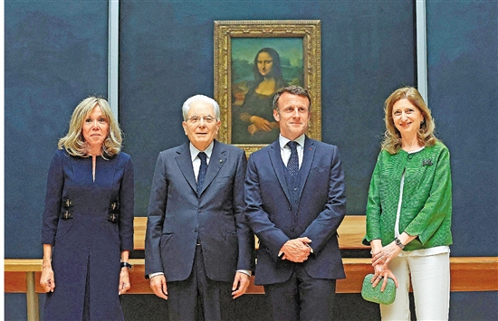 | 6月7日,法国总统马克龙(右二)与意大利总统马塔雷拉(左二)在巴黎卢浮宫博物馆参加意大利文艺复兴时期作品展开幕仪式,展览名为“那不勒斯在巴黎”。来自意大利的60余件文艺复兴时期艺术作品,将与卢浮宫的意大利藏品一同展出至2024年1月8日。 新华社发 |