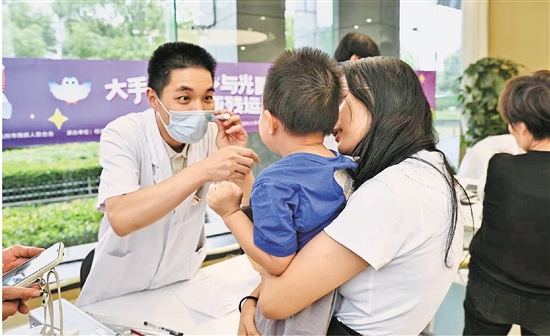 温医大附属眼视光医院眼科医生为儿童开展视力检查。 温医大附属眼视光医院供图