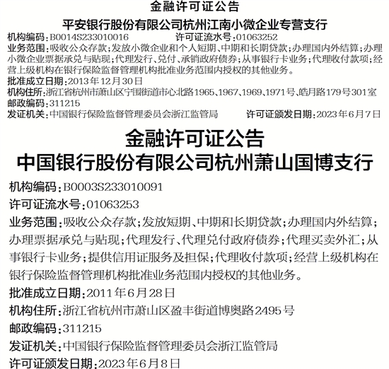 发证机关:中国银行保险监督管理委员会浙江监管局 许可证颁发日期:2023年6月7日