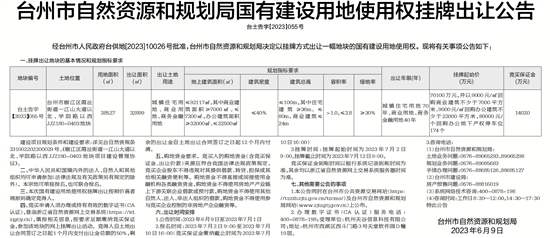 经台州市人民政府台供地[2023]10026号批准,台州市自然资源和规划局决定以挂牌方式出让一幅地块的国有建设用地使用权。现将有关事项公告如下:
