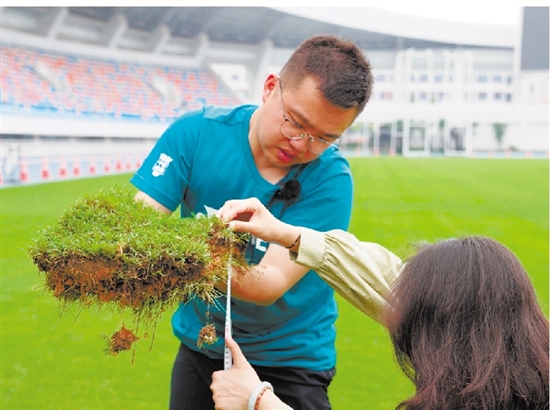临平体育中心设施运维领域工作组成员检查足球场草根生长情况 马赛洁 摄