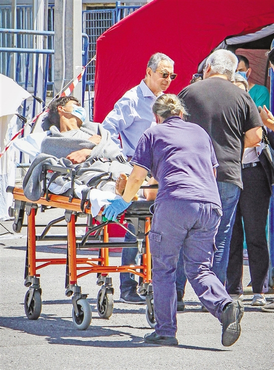 上图:在希腊卡拉马塔港口,医务人员运送伤员。 新华社发