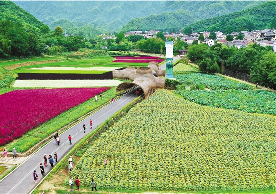 湖州市安吉县余村村建设五彩稻田、荷花塘等生态景观,大力发展生态低碳的观光休闲农业,打造生态旅游大景区,让村民共享绿色发展红利。