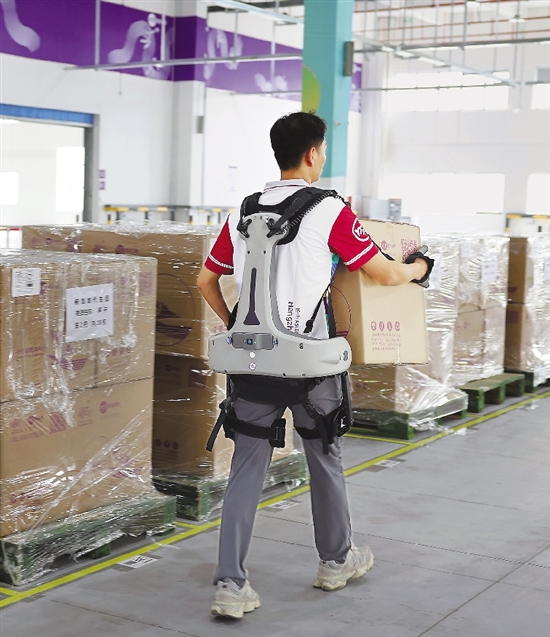 操作人员正穿戴着外骨骼设备搬运货物。 本报记者 俞碧寅 摄