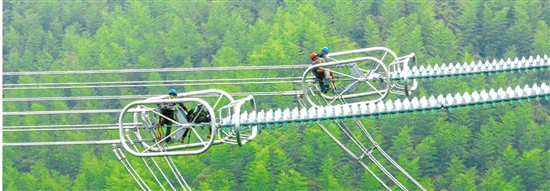 工作人员对工程输电线路进行验收。 国网浙江电力 供图