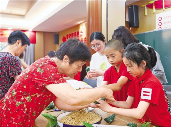 杭州育才登云小学学生、党员教师和拱墅勤丰社区老人一起包粽子。 本报记者 姚颖康 拍友 唐瑭 摄