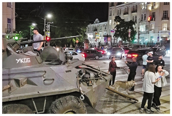 6月24日,在俄罗斯顿河畔罗斯托夫,当地居民站在装甲车旁(视频截图)。瓦格纳组织人员及其所有重型军事装备24日深夜已完全离开俄南部军区总部所在区域。 新华社发