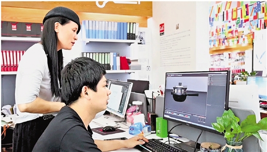 刘萍娟(左)与工作人员讨论产品设计细节。 拍友 吴峰宇 摄