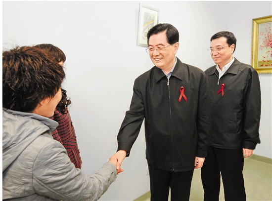 2008年12月1日是第21个世界艾滋病日。胡锦涛同志和李克强同志来到北京地坛医院考察艾滋病防治工作。 新华社记者 马占成 摄