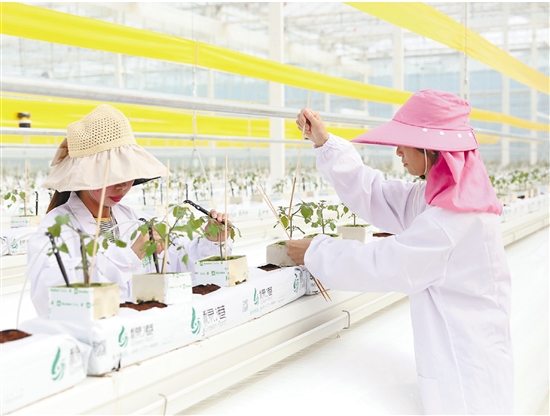 ◀ 近日,在安吉县农高新集团的数字化玻璃温室内,工作人员运用智慧化技术定植番茄。据悉,首批定植番茄共3万株,12月底即可产出,预计产量2万斤,产值20万元。