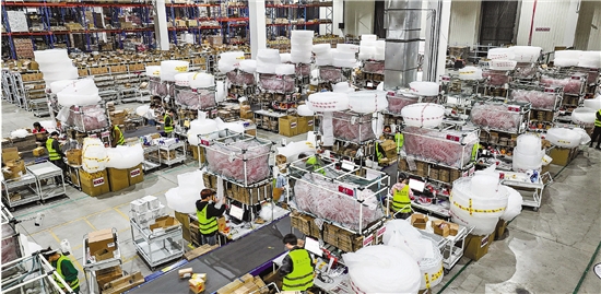 连日来,金义综合保税区跨境电商仓内灯火通明,快递包裹堆满月台。200余名工人正在全力奋战,整个仓库一派繁忙景象。