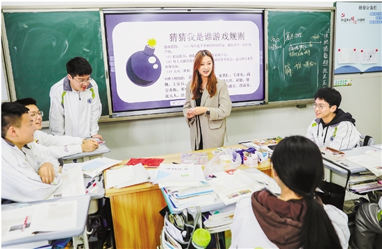 徐娇娇(中)在历史课堂上和同学们玩起卡牌游戏。 共享联盟·湖州 吴拯 摄