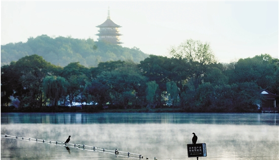 11月13日,受冷空气影响,杭州急剧降温,早晨最低气温只有4.4℃,由于温差变化,西湖景区小南湖水域形成烟波渺渺的美丽画卷。
