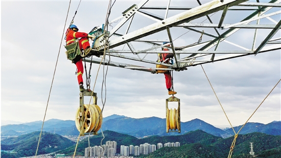 | 11月13日,浙江启明电力集团有限公司施工人员顶着寒风,在舟山市普陀区青龙山顶组装输电铁塔。该塔为舟山北塘110千伏23号铁塔,净高达76米,历经半个月的紧张施工,于当天完成组立。 拍友 姚峰 王建波 摄 |