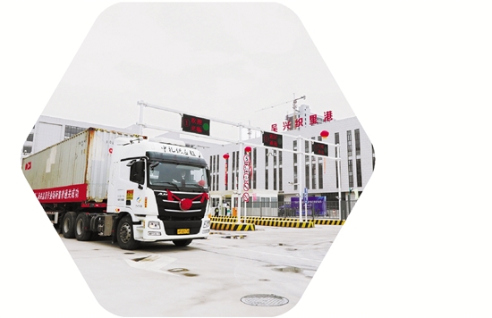 装满童装的集装箱车,驶离“吴兴织里港”海关监管作业场所。 王洁涵 摄