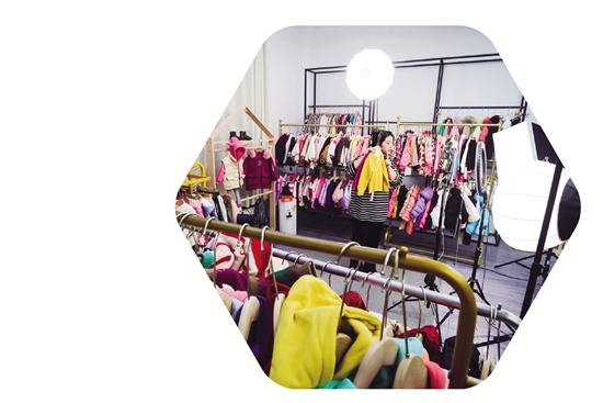 直播基地内,一名带货主播正在网上直播间展示最新款童装。 王洁涵 摄