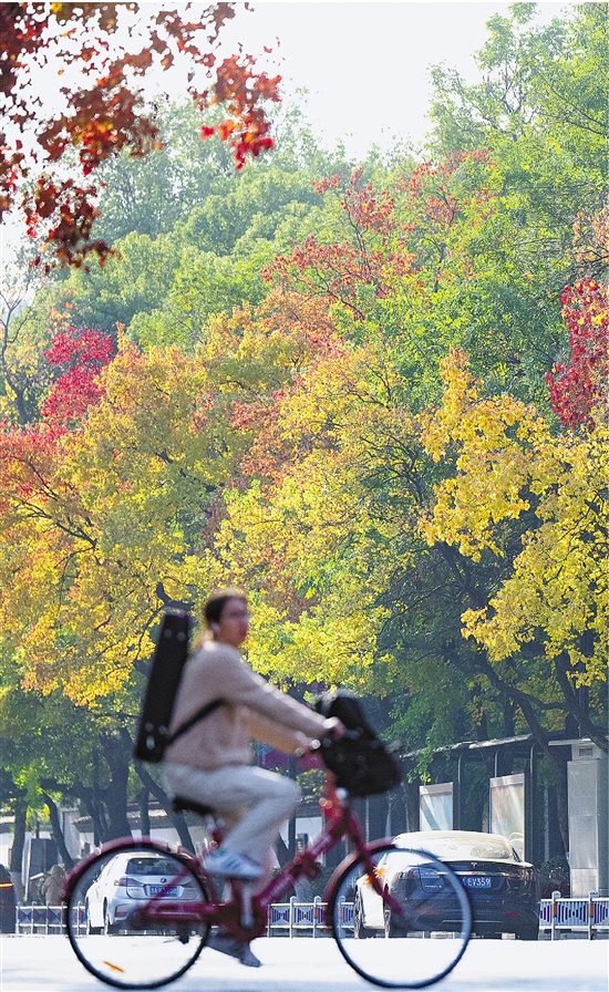 这些天,途经杭州保俶北路,人们都会被沿途的乌桕树所吸引。树叶在阳光下呈现斑斓的色彩,很是美丽。图为11月24日的保俶北路街景。 本报记者 徐彦 摄