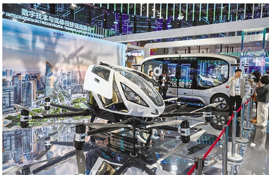 在第二届全球数字贸易博览会上,观众不仅能接触到全球数字贸易发展前沿技术,还能参与多样的互动体验活动。图为现场展示的可载人的无人驾驶飞行器。 本报记者 董旭明 摄
