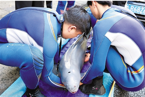 杭州长乔极地海洋公园工作人员在救助江豚。 杭州长乔极地海洋公园供图