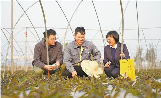 郑奇(右)带着本报记者(左)在田间地头走访农户。 拍友 陶钇成 摄