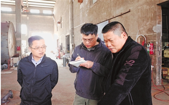 在台州市鼎鑫防腐设备科技有限公司生产车间,洪荣杰(左)向企业负责人陈岳君(右)咨询财务状况,本报记者吉文磊(中)做记录。 本报见习记者 张熙锦 摄