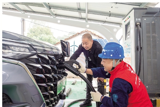 在金东区赤松镇北山口村“光储充”一体化充电站,电力工作人员为来充电的客户服务。