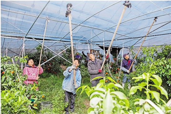 12月16日,宁波市北仑区大碶街道清泰果园大棚内,工人们在忙着加盖保温膜,抵御寒潮。 拍友 索向鲁 摄