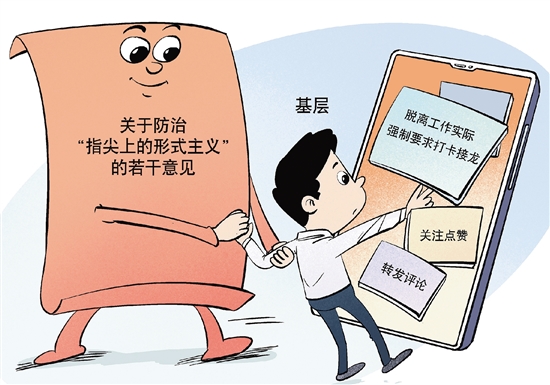 近日,中央网络安全和信息化委员会印发《关于防治“指尖上的形式主义”的若干意见》,要求加强对政务移动互联网应用程序、政务公众账号和工作群组的标准化规范化管理。意见指出,“指尖上的形式主义”是形式主义在数字化背景下的变异翻新,是加重基层负担的主要表现。防治“指尖上的形式主义”,对于推进党风政风社会风气向好具有重要意义。 图文均据新华社 |