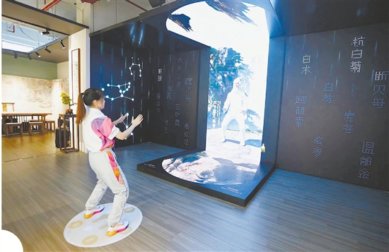 在亚运村媒体屋,游客正在电子屏前跟练八段锦