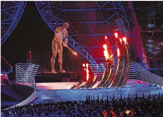 杭州亚运会开幕式上,汪顺与数字火炬手共同点燃亚运主火炬。