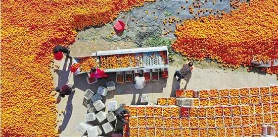 12月23日,在三门县浦坝港镇圩岙村,大晒场上堆满了金黄色的柑橘,村民正在对柑橘进行分拣、装运,准备发往外地销售,现场一派忙碌景象。 拍友 林利军 摄