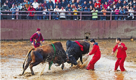 1月1日,金华市婺城区雅畈镇汉灶村举行传统斗牛活动,欢庆新年。 拍友 时宽兵 摄