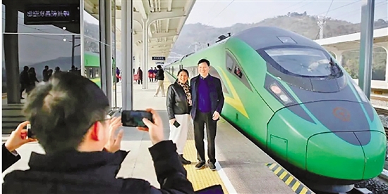 乘客在首趟列车前合影留念。 拍友 许天长 摄